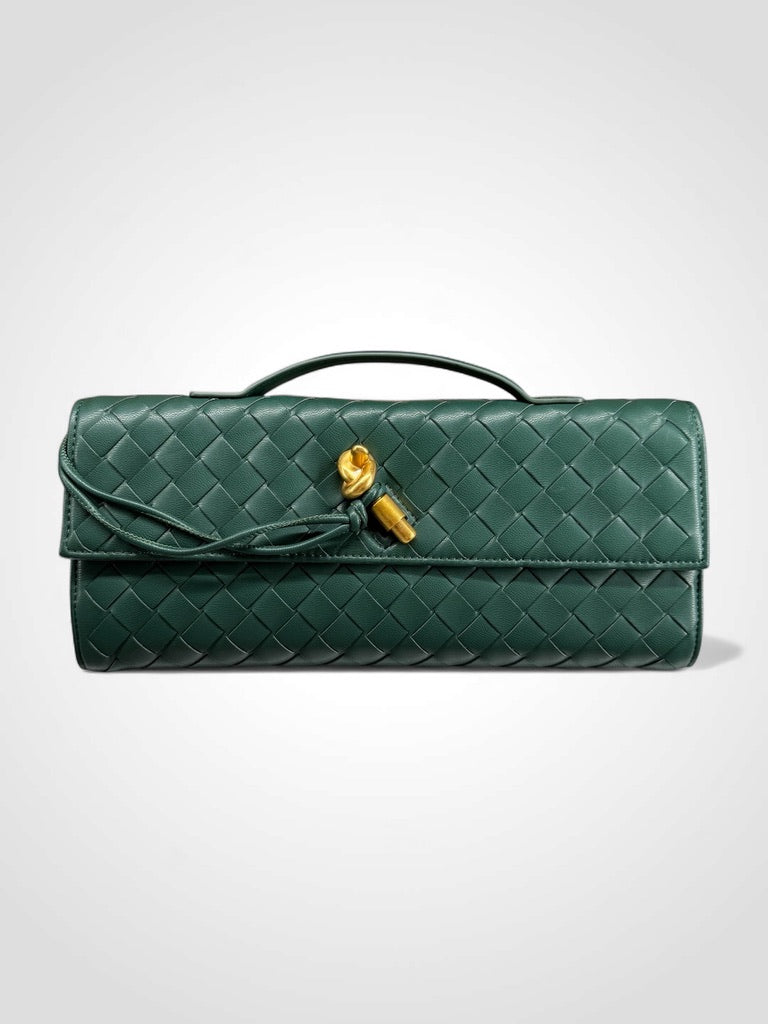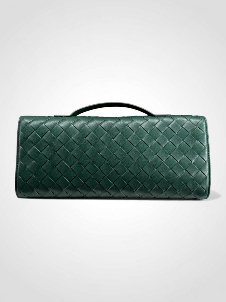 Dressed in Maison Moss, I bring the richness of deep green with the elegance of a vintage soirée. My handwoven silhouette in premium vegan leather is elegance with an edge—soft to the touch yet structured enough to hold your secrets (and your lipstick).