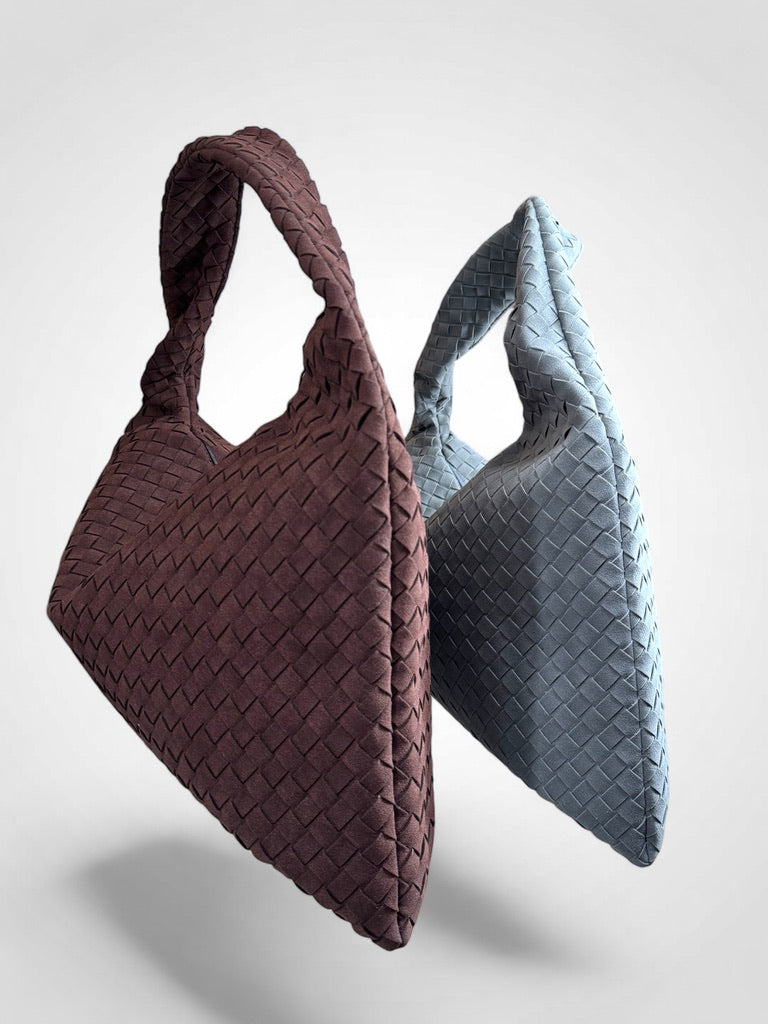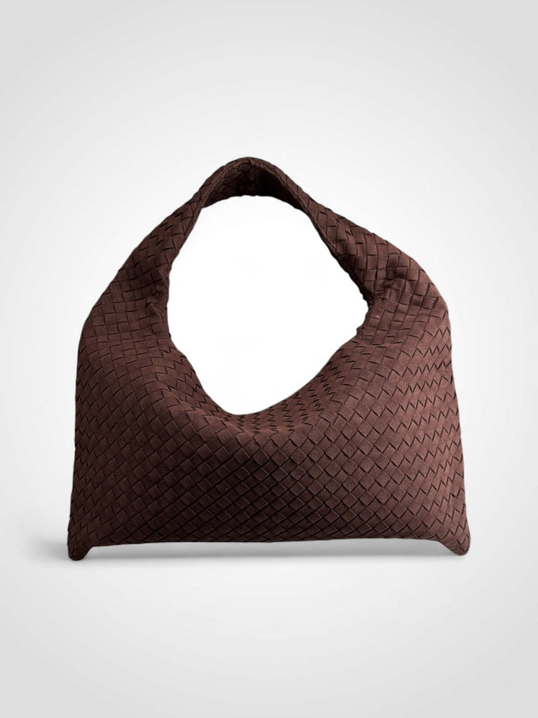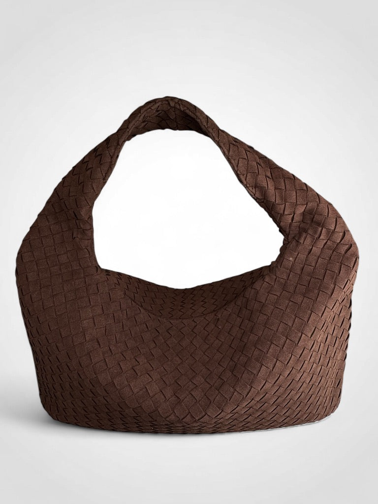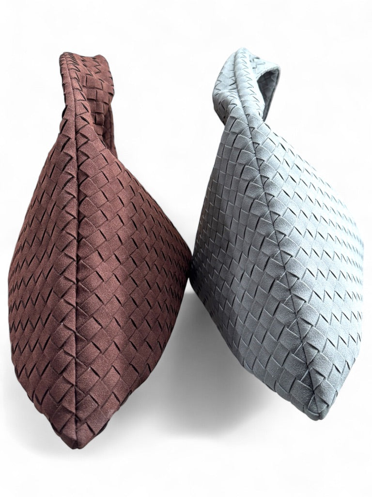 Crafted from luxe faux suede with a smooth vegan leather interior, I balance softness with strength. My woven body adds texture and presence, while a magnetic closure keeps things neatly tucked in.
