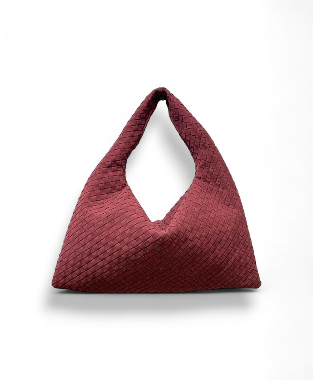 Crafted from luxe faux suede with a smooth vegan leather interior, I balance softness with strength. My woven body adds texture and presence, while a magnetic closure keeps things neatly tucked in.