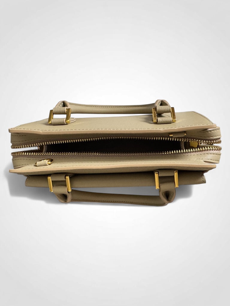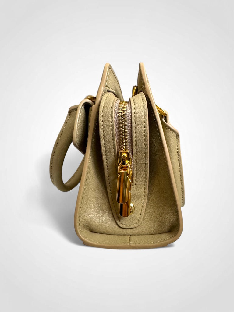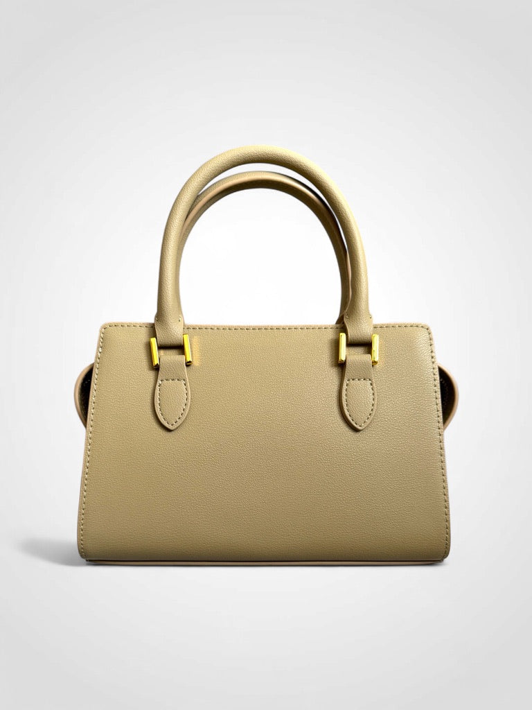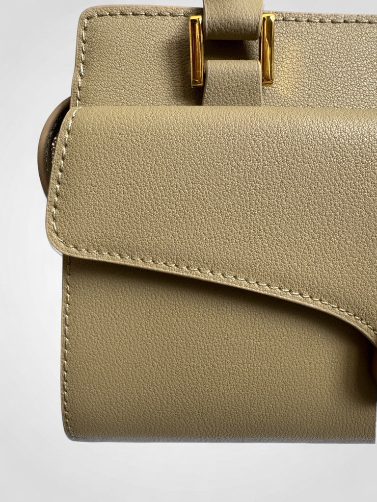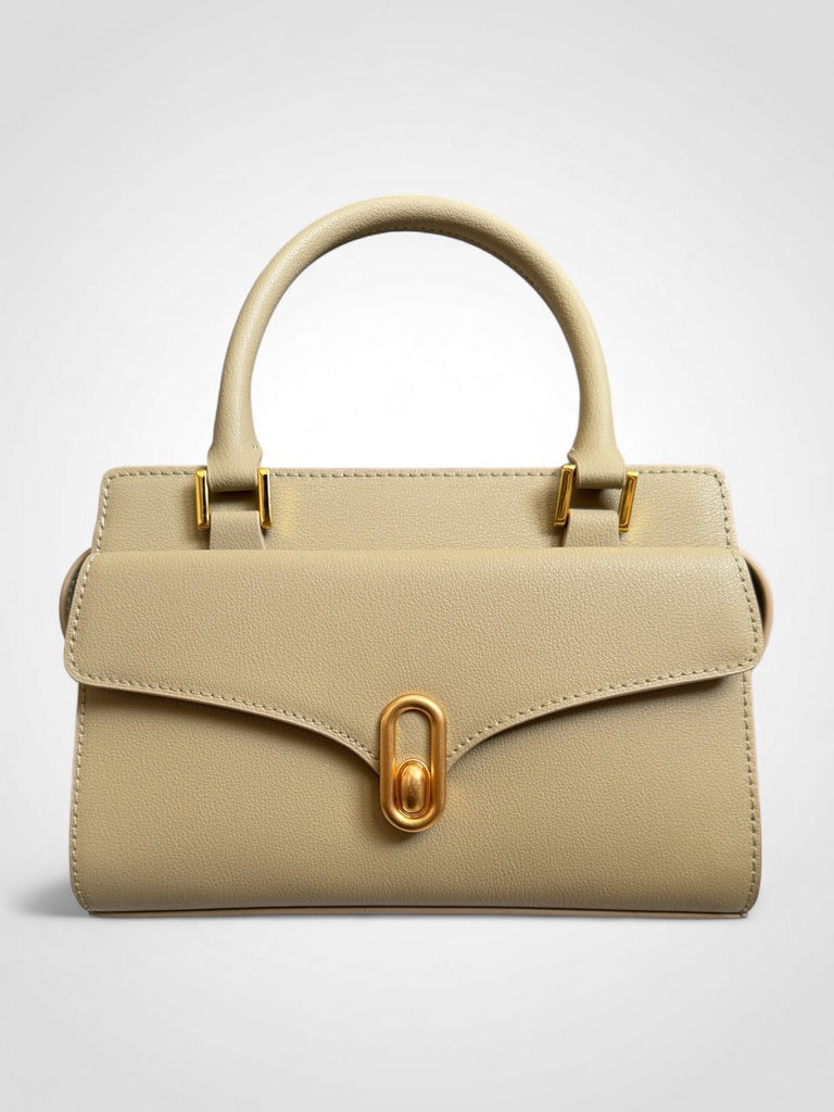 My gold hardware? Sculptural and striking. My adjustable leather strap lets you wear me your way—crossbody, shoulder, or not at all. I sit just as confidently in hand when you want to keep things close.