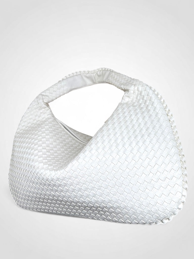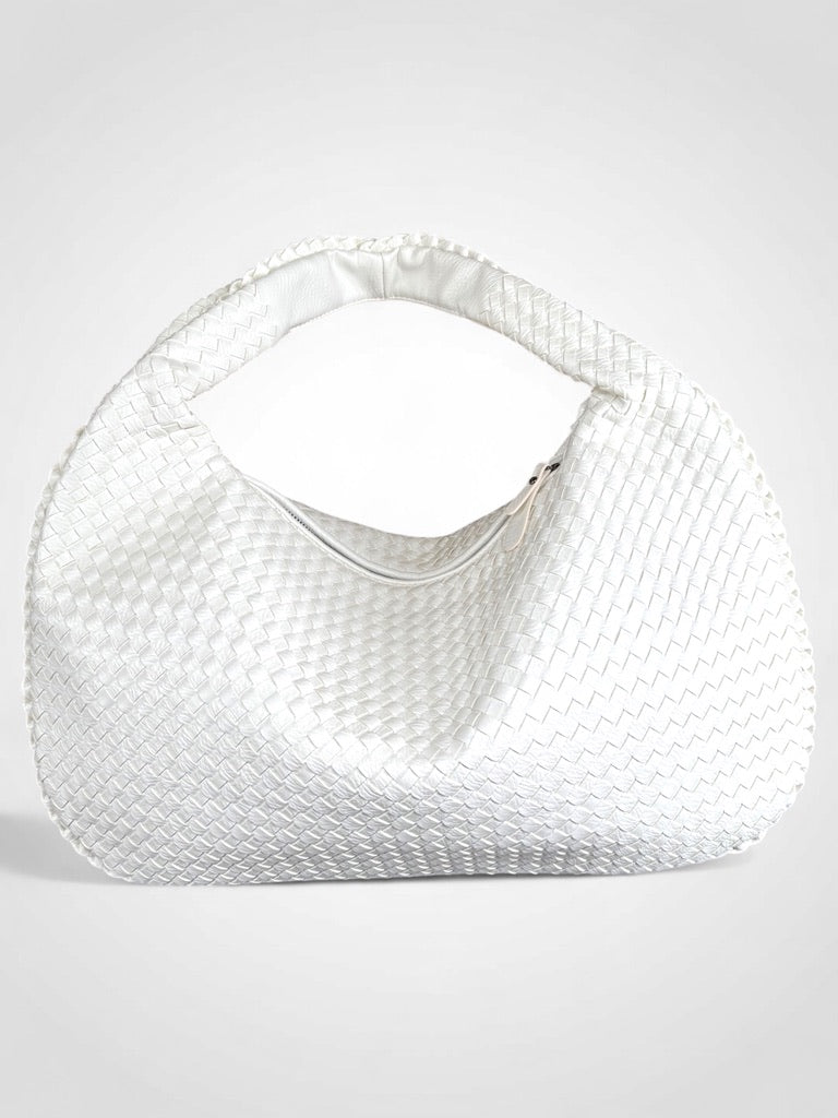 I come in Chiffon—crisp, clean, and effortlessly elegant. I’m here to hold your essentials, your extras, and your just-in-case’s. With a soft, sculpted silhouette and a bold woven finish, I’m that rare combo of comfy and collected.