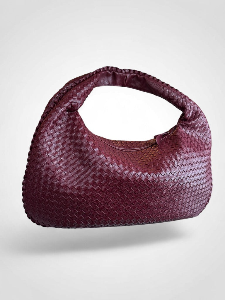 I come in rich Merlot—deep, juicy, and full of attitude. I’m here to hold your essentials, your extras, and your just-in-case’s. With a soft, sculpted silhouette and a bold woven finish, I’m that rare combo of comfy and collected.